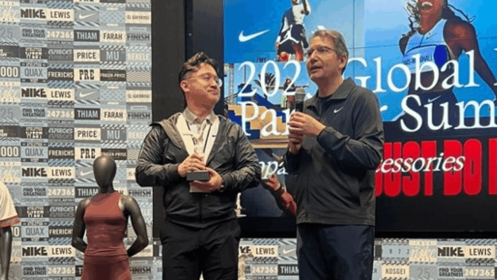 Tegra CEO Rich Hwang (left) receives “Athlete Mindset Award” from Marco Duarte, Senior Director at Nike (right) (Photo courtesy of Tegra)